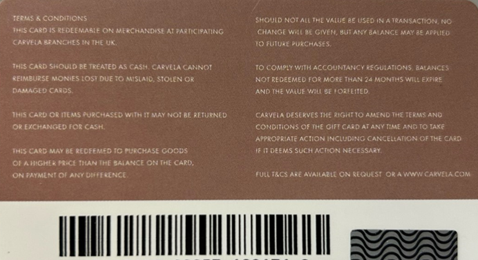 Carvela Gift Cards are issued in Carvela stores and can be used in Carvela and Kurt Geiger freestanding stores and Carvela outlets.